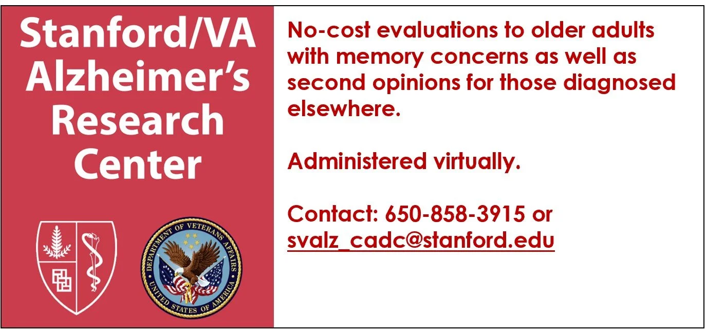 The Stanford/VA Alzheimer’s Research Center is an outstanding, free resource for older adults concerned about memory loss. Evaluations last approximately 2.5 hours and include a neurological examination, neuropsychological testing, and interviews with both the patients and caregiver(s). These evaluations are administered virtually by an interdisciplinary team, so you don’t need to live near Stanford to take advantage of this service.